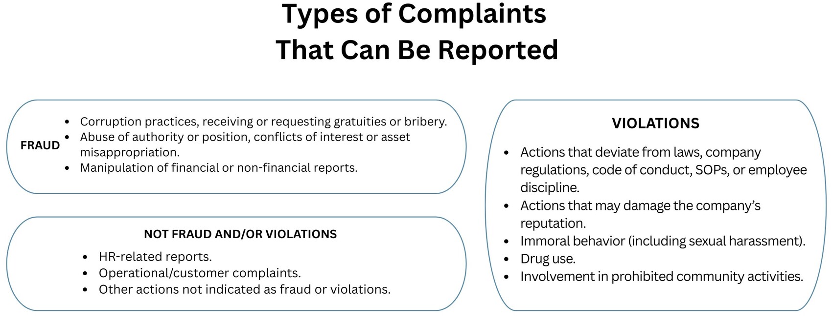 In order to facilitate and expedite the follow-up process, reports of fraud and/or violations should contain clear and accountable information, and may be supplemented with relevant, competent, and sufficient preliminary evidence, including but not limited to:
